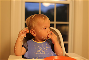 The boys had dinner at home -- mashed hutspot -- and then joined us in their highchairs. They happily chewed on a piece bread and loved the watermelon.