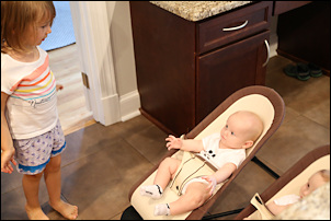 I was making some noise in the kitchen this evening, and Leo and Adrian were sitting in their bouncy chairs nearby. They didn't like the noise but their big sister came to calm them down. Nora to the boys:
