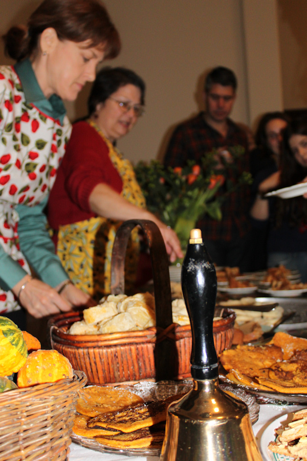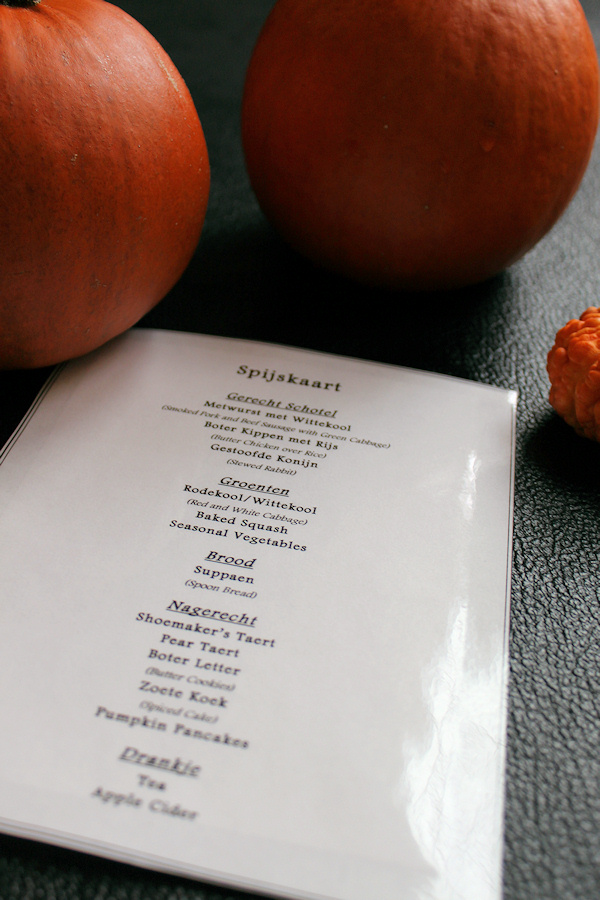 "The dishes had a lot of Dutch cultural influences, but also incorporated what we knew the colonists appropriated from the native Americans, which is why there was a corn meal based bread pudding on the table, and pancakes with pumpkin mash. I also tried to stick with fall vegetables such as cabbage, carrots, beets, onions, celeriac and squash (another New World staple), and with foods that the colonists would also likely have preserved, such as dried peas and smoked metworst. Interestingly, spices such as nutmeg and pepper were available in the 1600's, due to the Dutch spice trading".