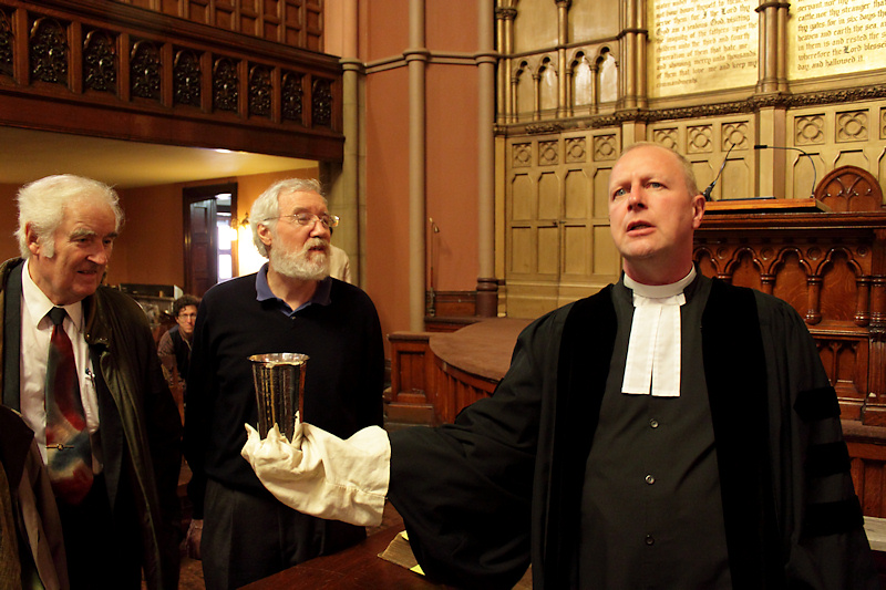 Pastor Meeter shows the communion cup.