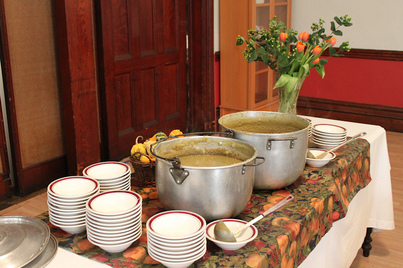Dinner was served after the sermon. "Dinner" is used in its original meaning: the first meal of the day, eaten about noon. A team of many volunteers worked for two days to prepare the meal.