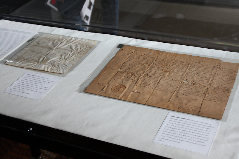 Eight historic documents, most of them in Dutch, were on display. One of the most interesting exhibits is the land grant with the signature and seal of Petrus Stuyvesant, Director General of New Netherland, dating from 1661. Written in Dutch, this document establishes the Lefferts family's property in New Netherland.