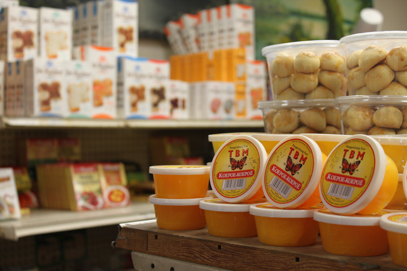 The groceries section has a large selection of Dutch and Indonesian products. There’s a large selection of drop and Dutch sweets, Honig soups and Delftware. There’s a large selection of Indonesian spices and condiments, and fresh made kroepoek is available for sale.