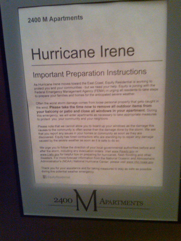 Hurricane Irene is on its way from North Carolina to the northern part of the United States. It is not assumed to hit Washington, DC directly and has lost a lot of its strength, but high water and strong winds could cause a lot of damage.