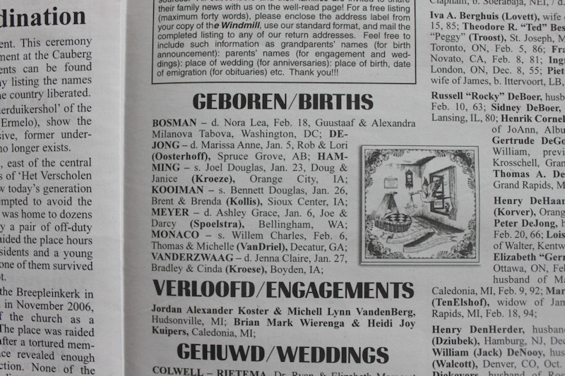 Nora's birth announcement was placed in the bi-weekly Windmill Herald, a newspaper for Dutch people in North America.