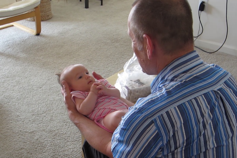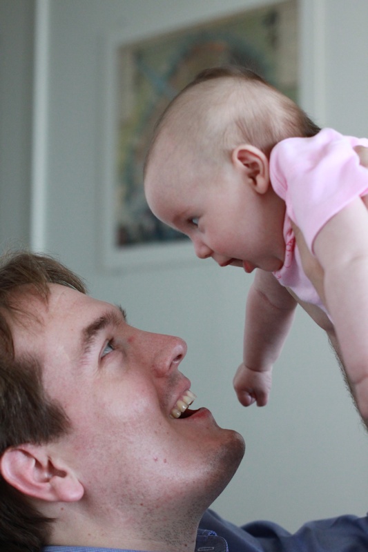 Nora and Jaap are having a very good time together. She likes to look at his face and then she smiles.