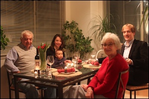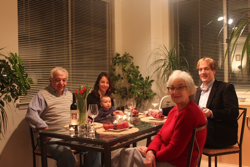 Yesterday we celebrated New Year's Eve with a nice family dinner with Milan and Nadia. Food was our beloved traditional set of dishes -- mlechna and ruska salad, roasted turkey on home-made sauerkraut and Nadia made a great baklava dessert. A bowl with oliebollen complimented the meal.