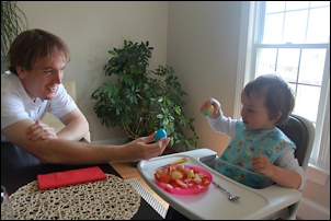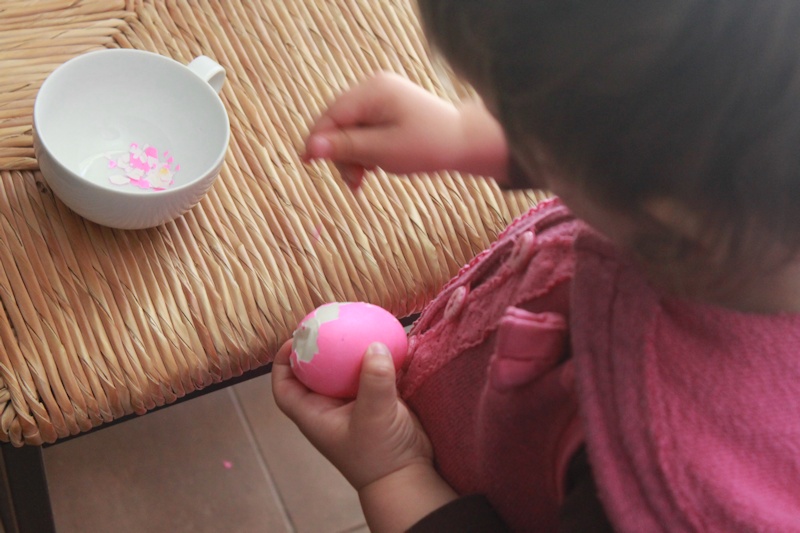 A few weeks ago with Easter, we colored eggs. Nora really enjoyed peeling the eggs, one tiny piece of shell at the time. She is so patient.