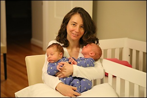 They are super regular and wake up by themselves every three hours to eat. Getting up in the middle for the night is not as hard as it sound, as long as you can take a nap or two during the day. The scariest part is that you never know if they'll truly fall asleep after a feeding. If one of them has hiccups or something bothering them, it might take a while before we can all go back to sleep. That will get better over time -- they are still very little of course. It's very special to be around them, and I am very happy. It's great also to spend more time with Nora: she usually hangs out with us in the bedroom and we talk and read books a lot.