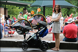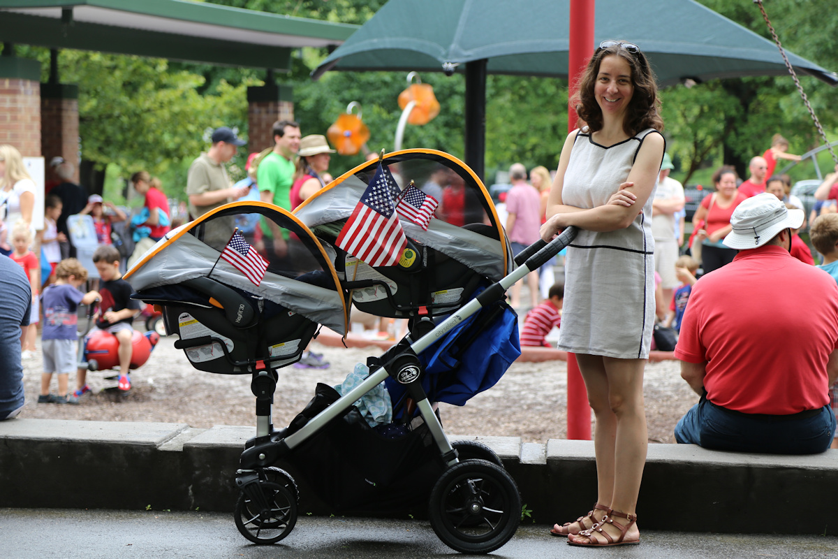 We slept in this morning and when we woke up it was raining a lot. But at 10.15 pm the rain stopped -- and we decided to go to the Fourth of July Parade after all. The Parade was cut short because of the rain but we had a nice time in the Lyon Village playground. Hopefully next year the weather will be better.