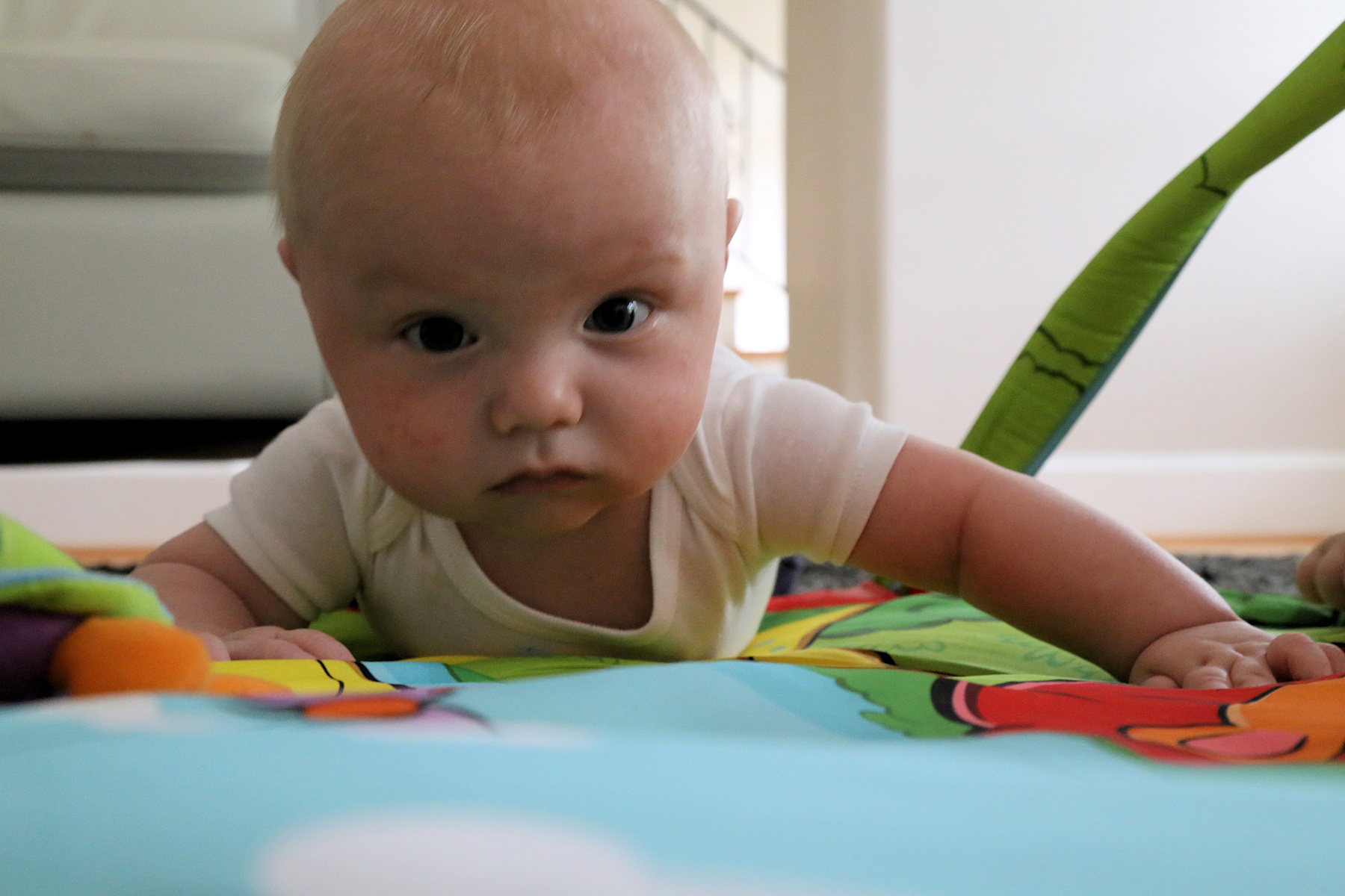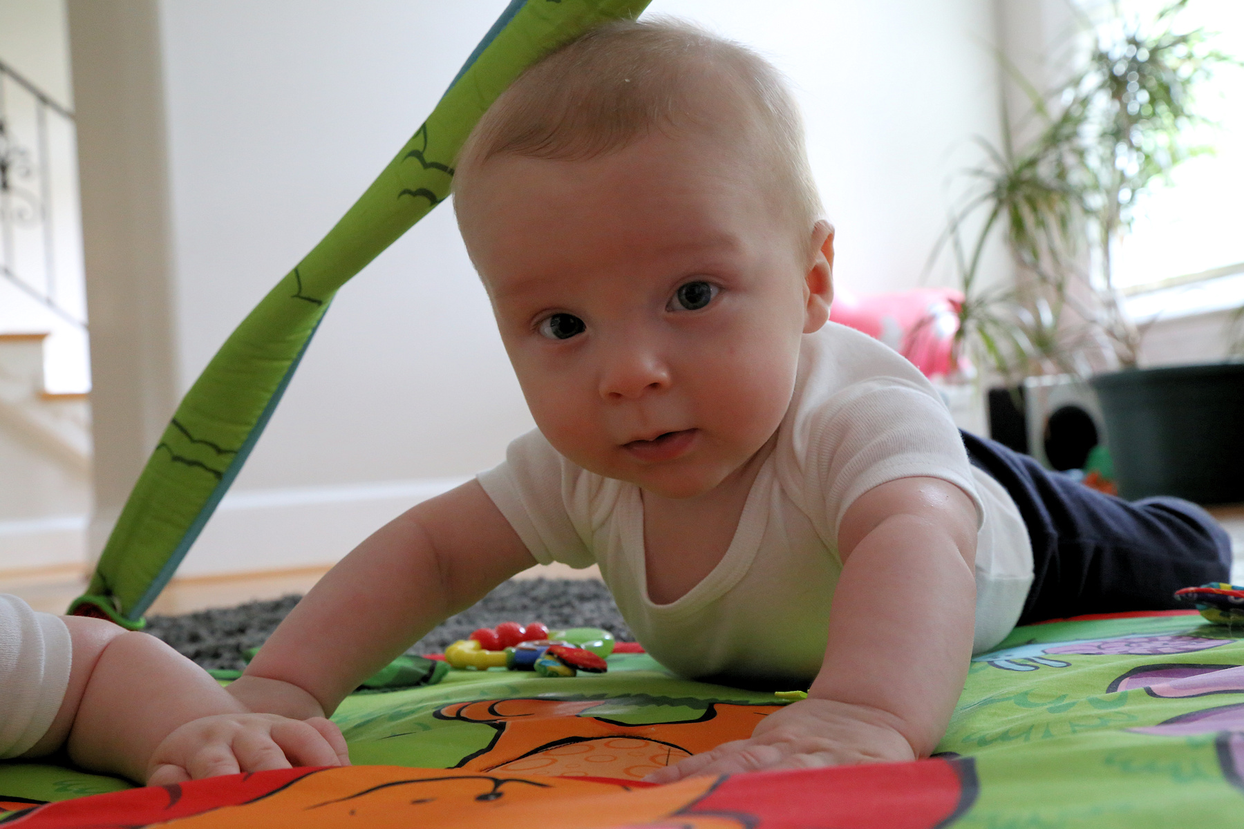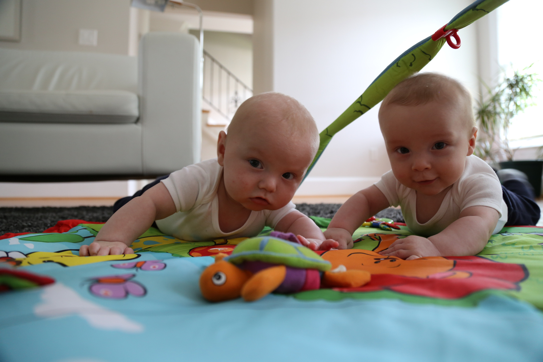 They enjoy tummy time more and more. They can hold their heads up well and start to wiggle around. Leo in particular knows very well how to roll over, from back to front and front to back. Sometimes he moves his legs around in a Pilates-like "swimming" move.