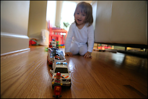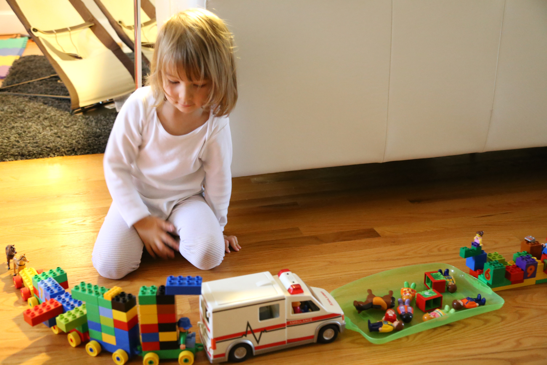 This morning Nora woke up at 7.00 am. After I brought her downstairs etc we agreed that she would play and I would go back upstairs, and so we did. She played for at least 45 minutes by herself, making a big convoy of her Lego and Playmobil. One of the boats she made from the Duplo blocks reminded me of the boats I used to make when I was little.