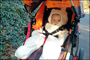 Yesterday I ran with Adrian for the first time. He enjoyed it -- he was moving his legs from excitement when we went downhill and later started singing.