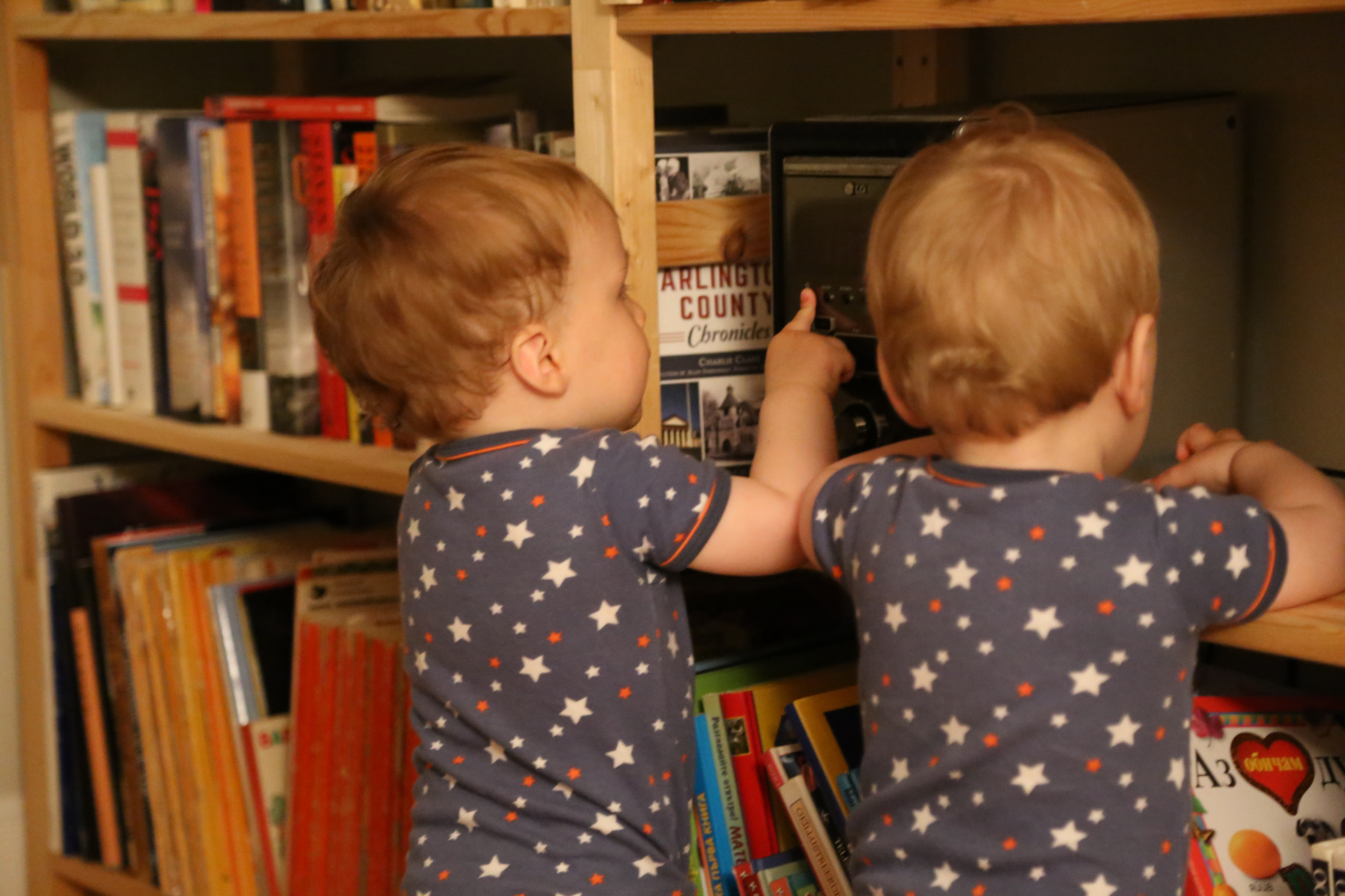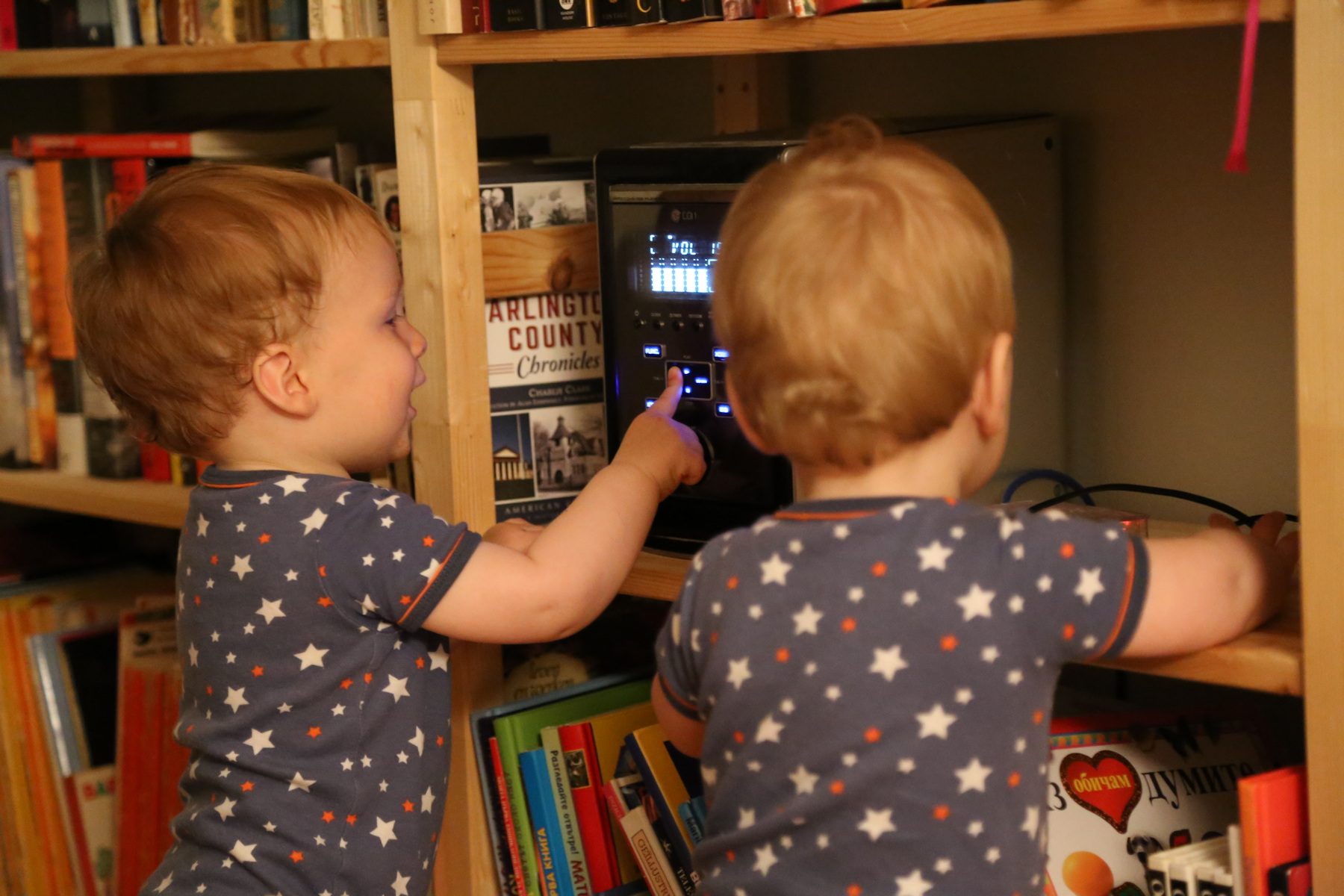 The boys figured out how to swtich on the radio, much to their delight. We let them roam around in the living room more frequently now, and they love it.