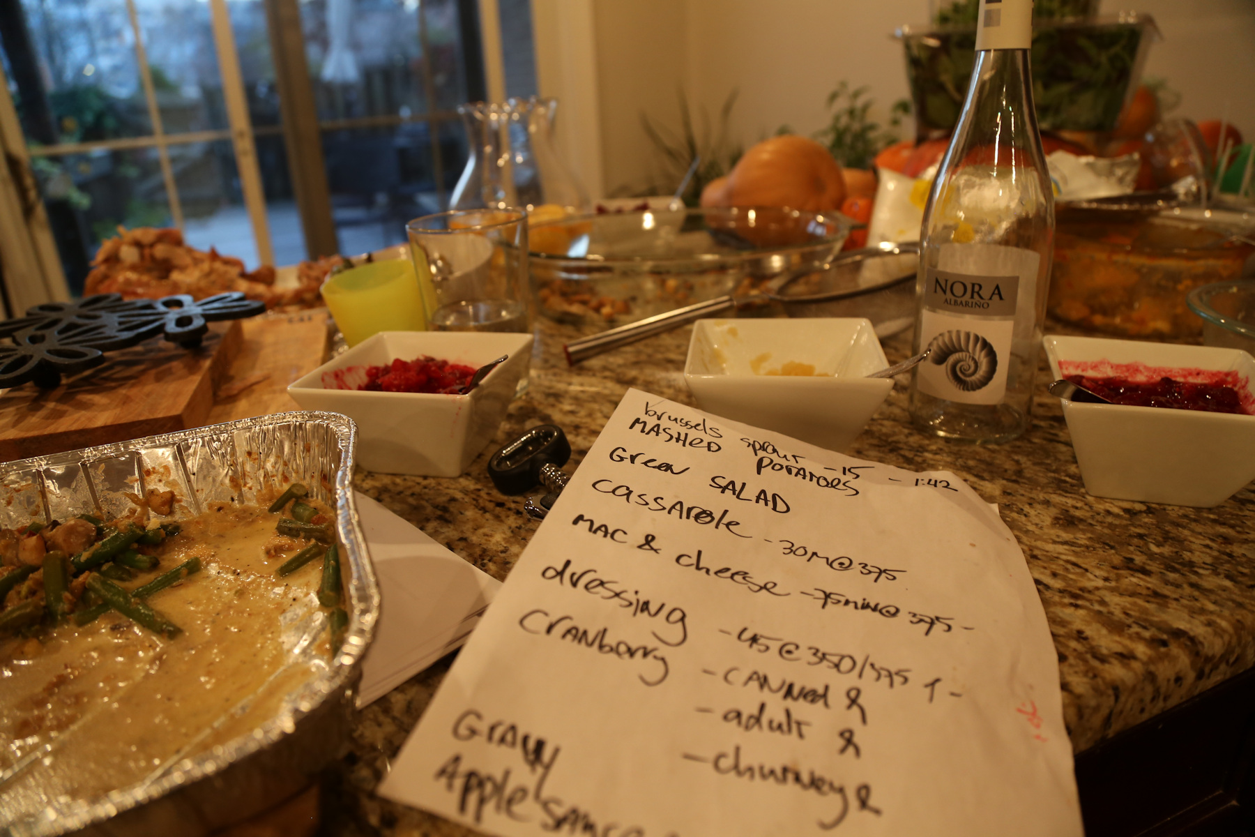 Judy joined us at 12.30 pm and the turkey was done shortly afterwards. We had lunch around 2.00 pm and it was a lot of fun. My cooking experiments worked out -- the green bean casserole was a big hit. The full menu is visible on the last photo below. For dessert we had Irena's brownie, a Dutch slagroomtaart and two other pies.