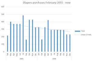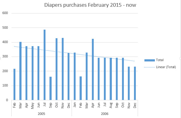 We've gone from an average of 400 diapers per month to 280 diapers per month.