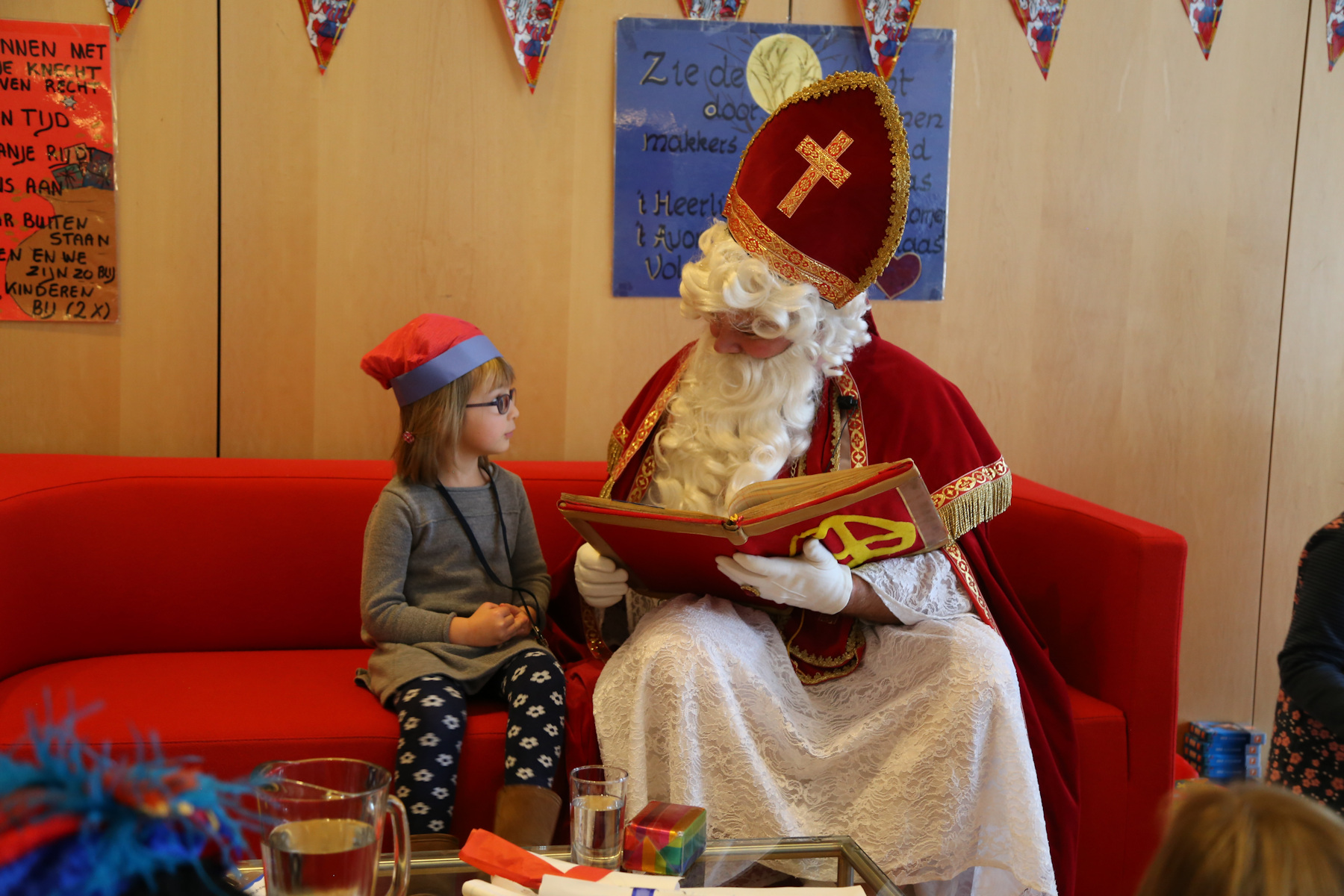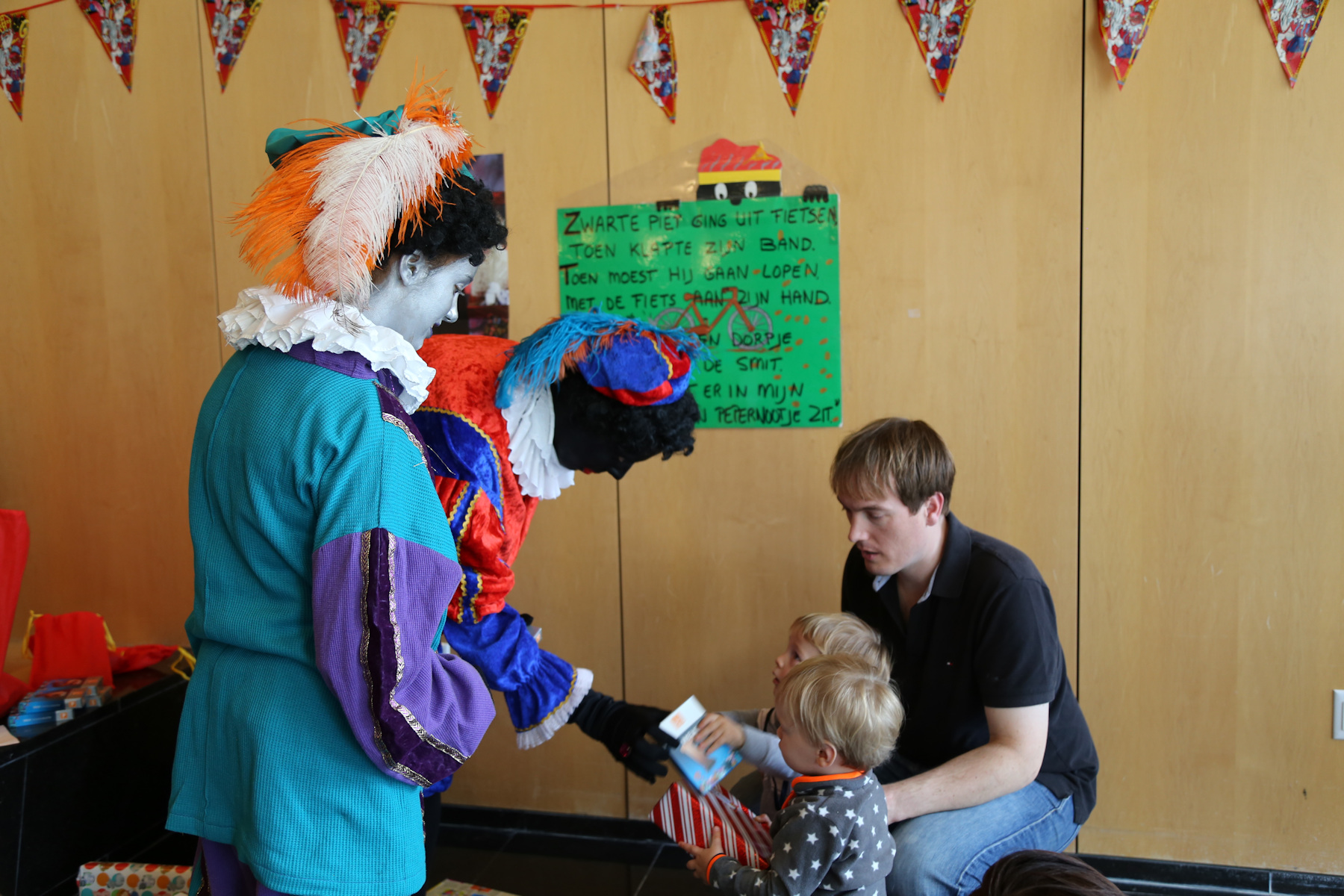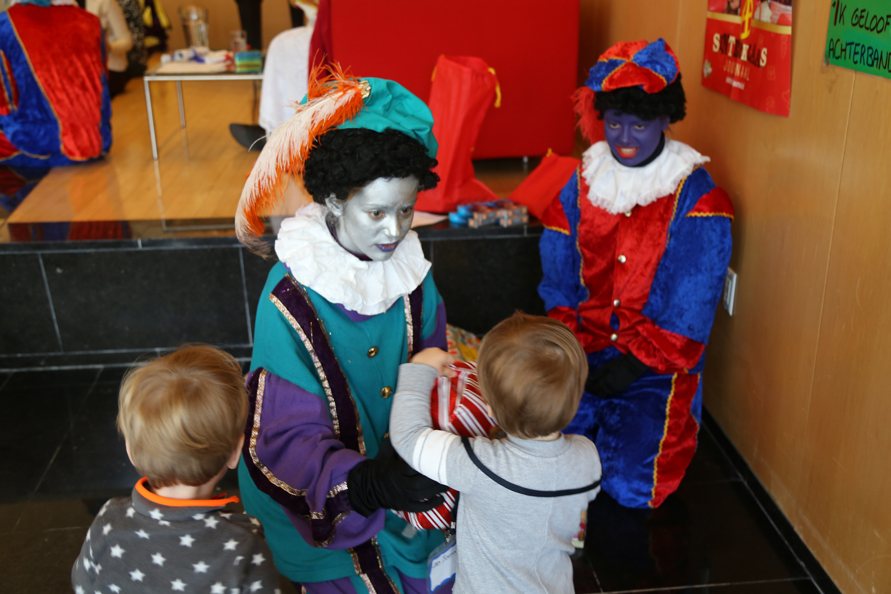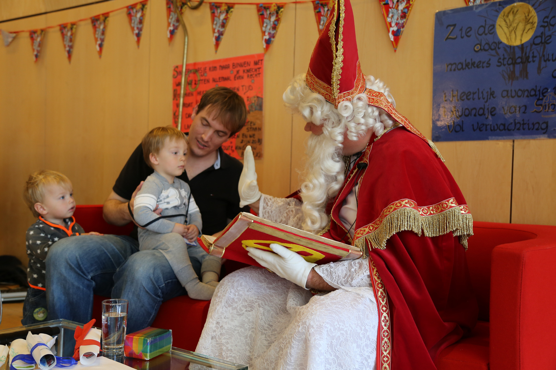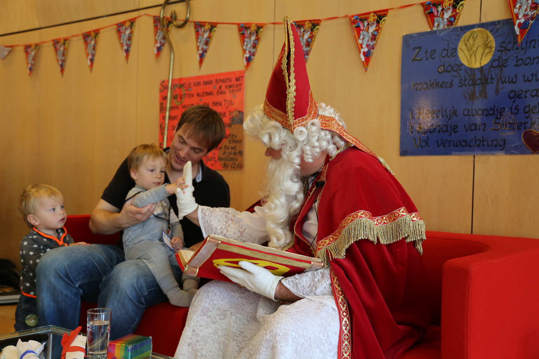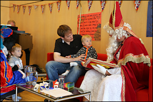 The boys were both quite impressed. Sasha was holding Leo, and I was holding Adrian and Nora when he arrived in the main hall. Adrian was staring with wide open eyes. Later, in the smaller room, he was pointing several times and yelling: "kaas! kaas!" (He can't say "klaas" yet).
