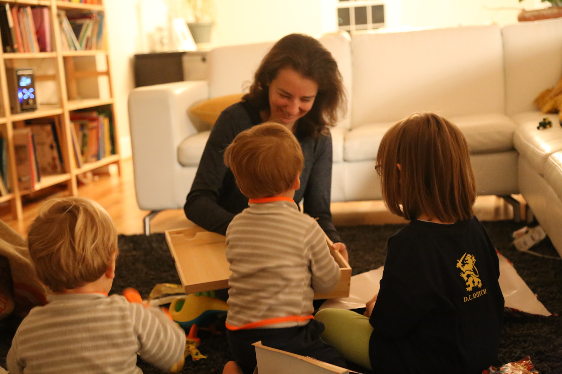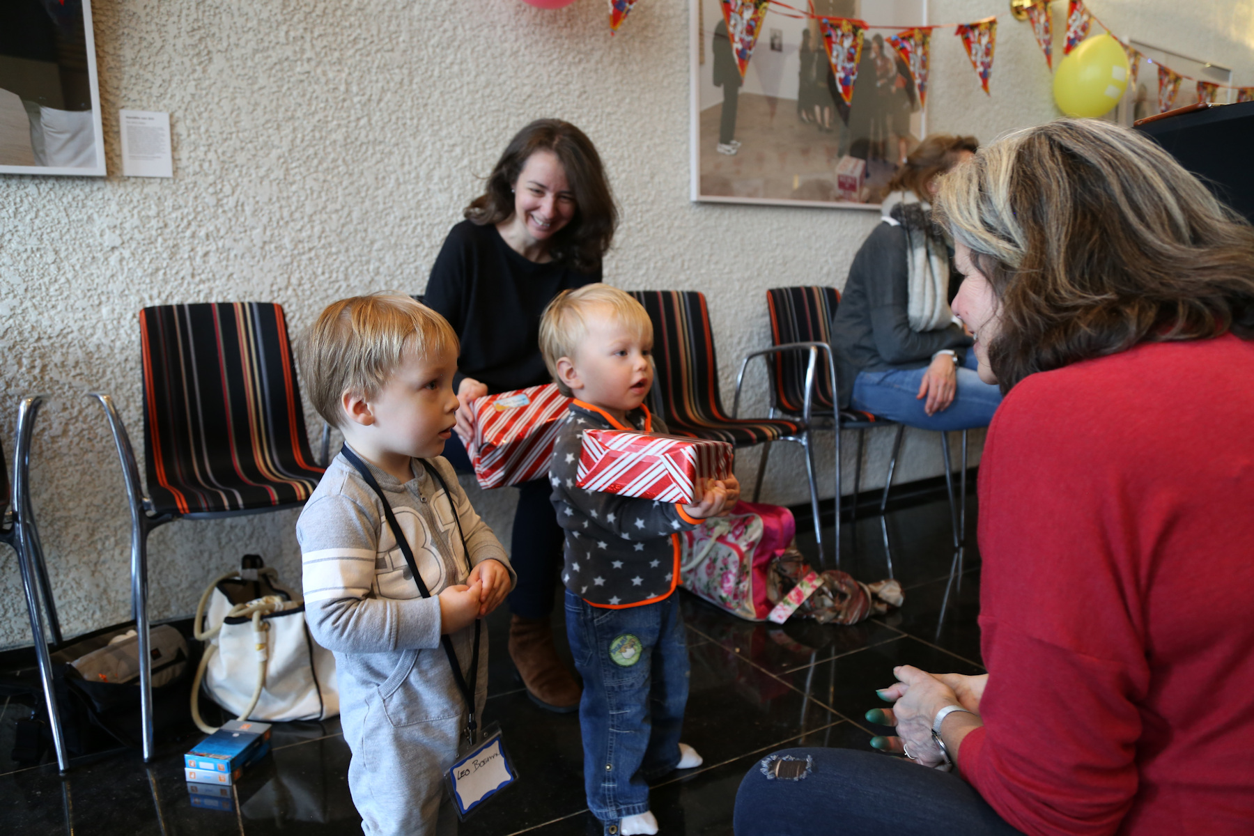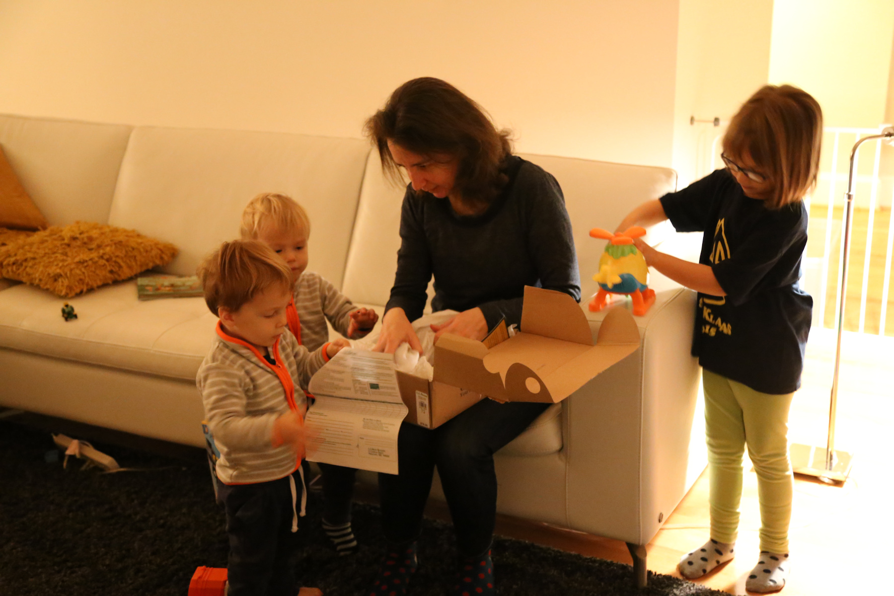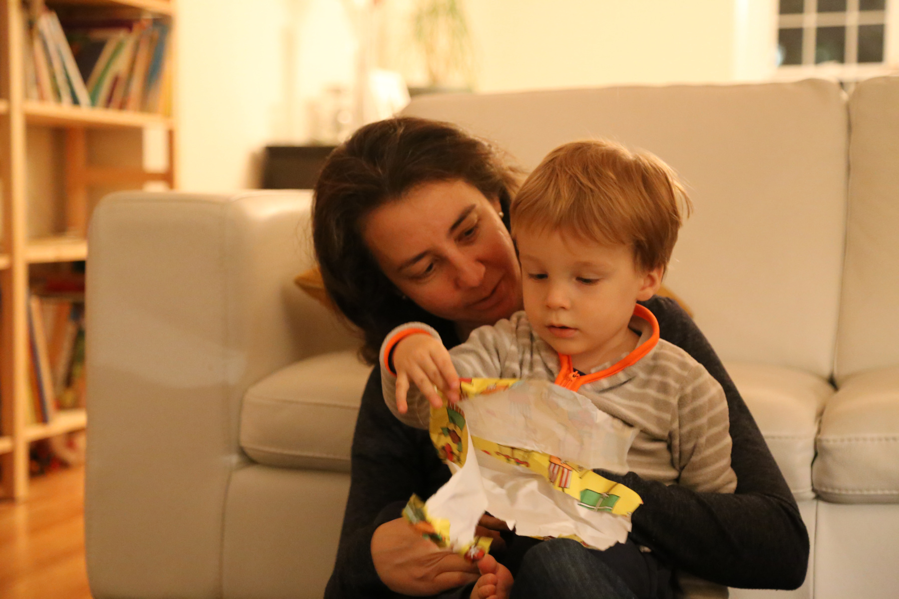 Nora's gift remained unopened until we got home. Instead she opened her chocolate letter right away -- she was probably hungry because we skipped lunch. Leo received a Playmobil 123 helicopter, Adrian a garbage truck ("bah!"). The boys also liked to boxes with the chocolate letters. Shanthi helped them unpack their gifts.