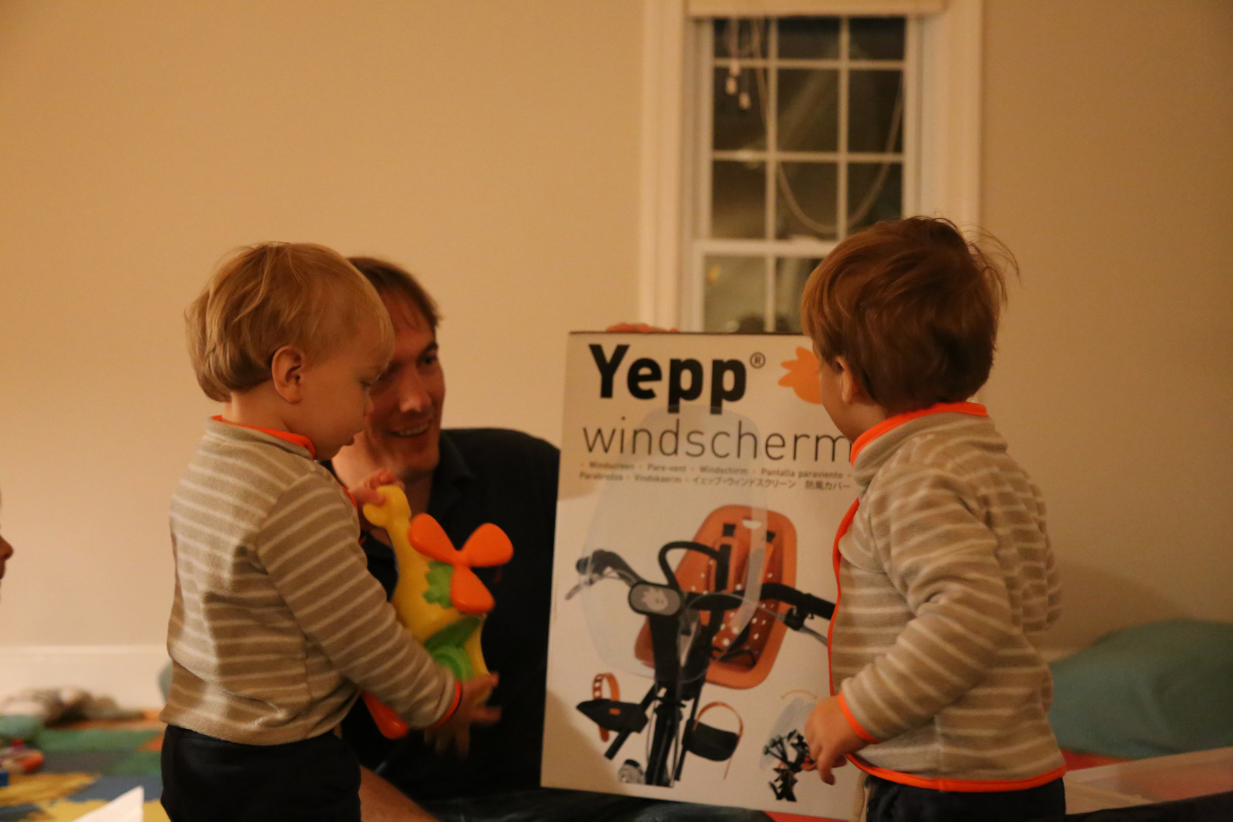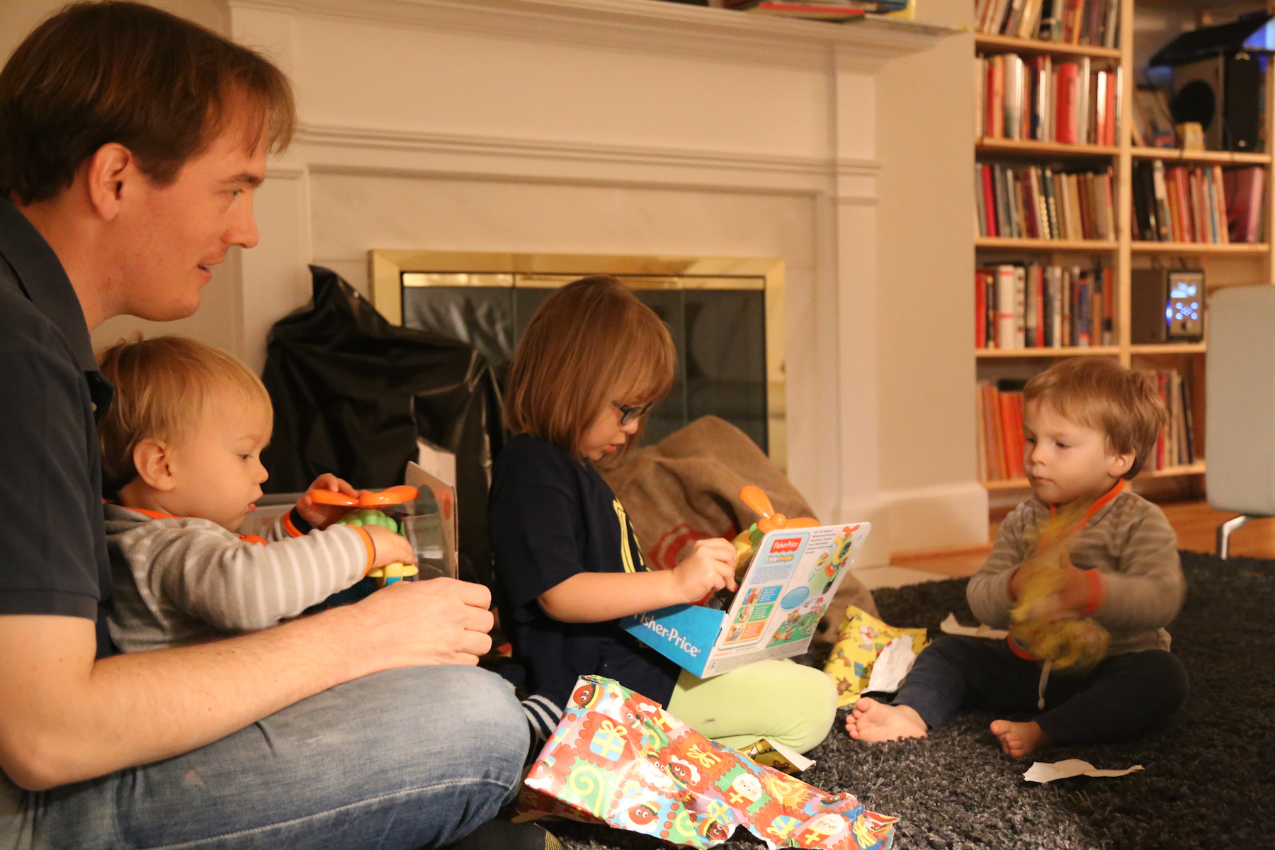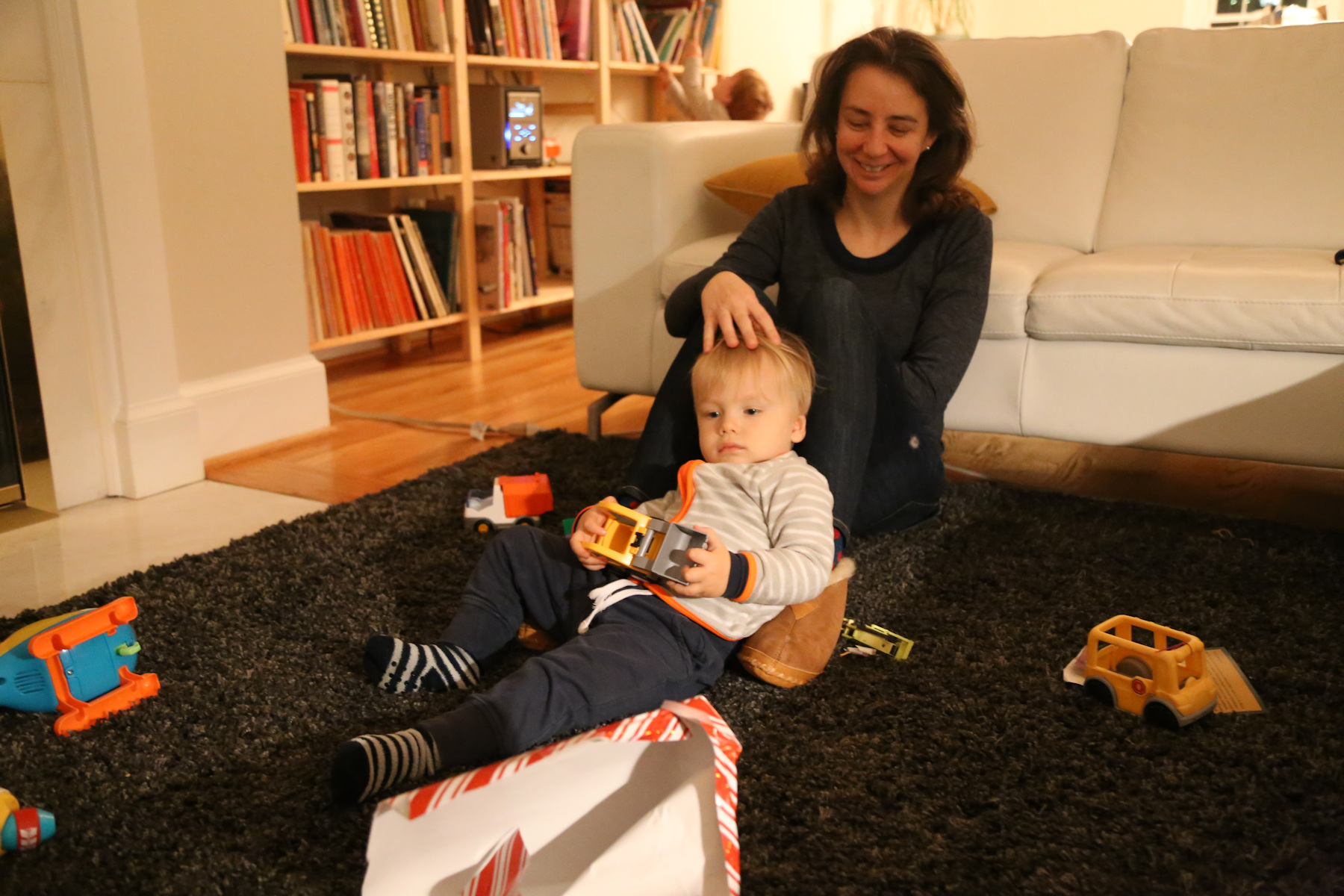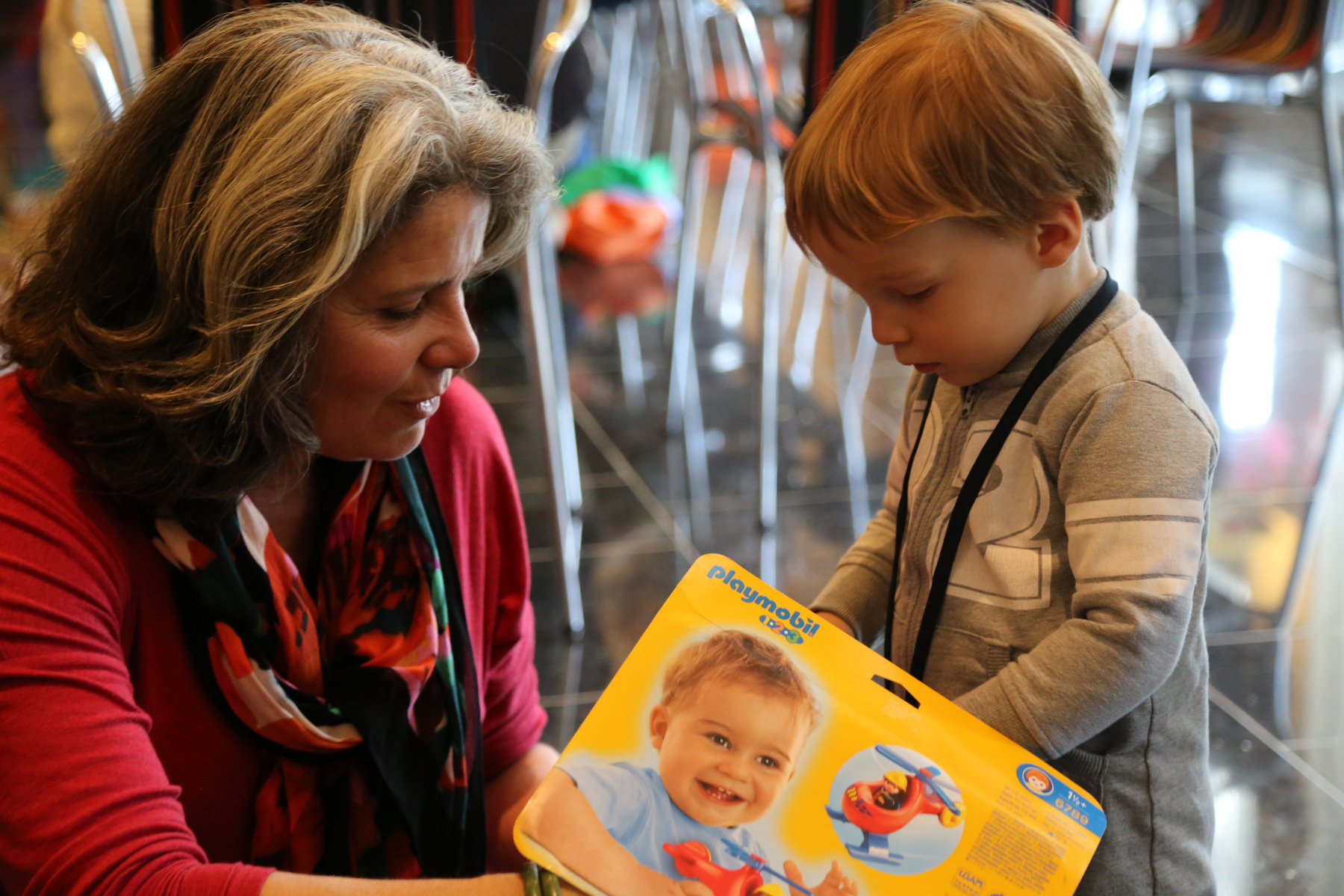 Nora's gift remained unopened until we got home. Instead she opened her chocolate letter right away -- she was probably hungry because we skipped lunch. Leo received a Playmobil 123 helicopter, Adrian a garbage truck ("bah!"). The boys also liked to boxes with the chocolate letters. Shanthi helped them unpack their gifts.