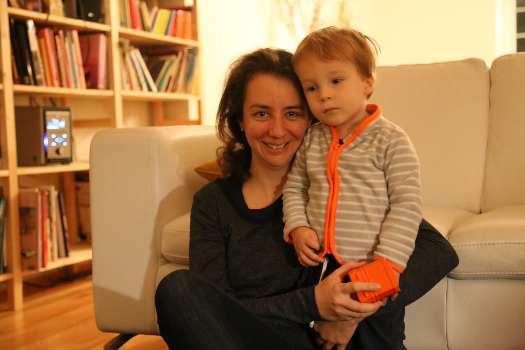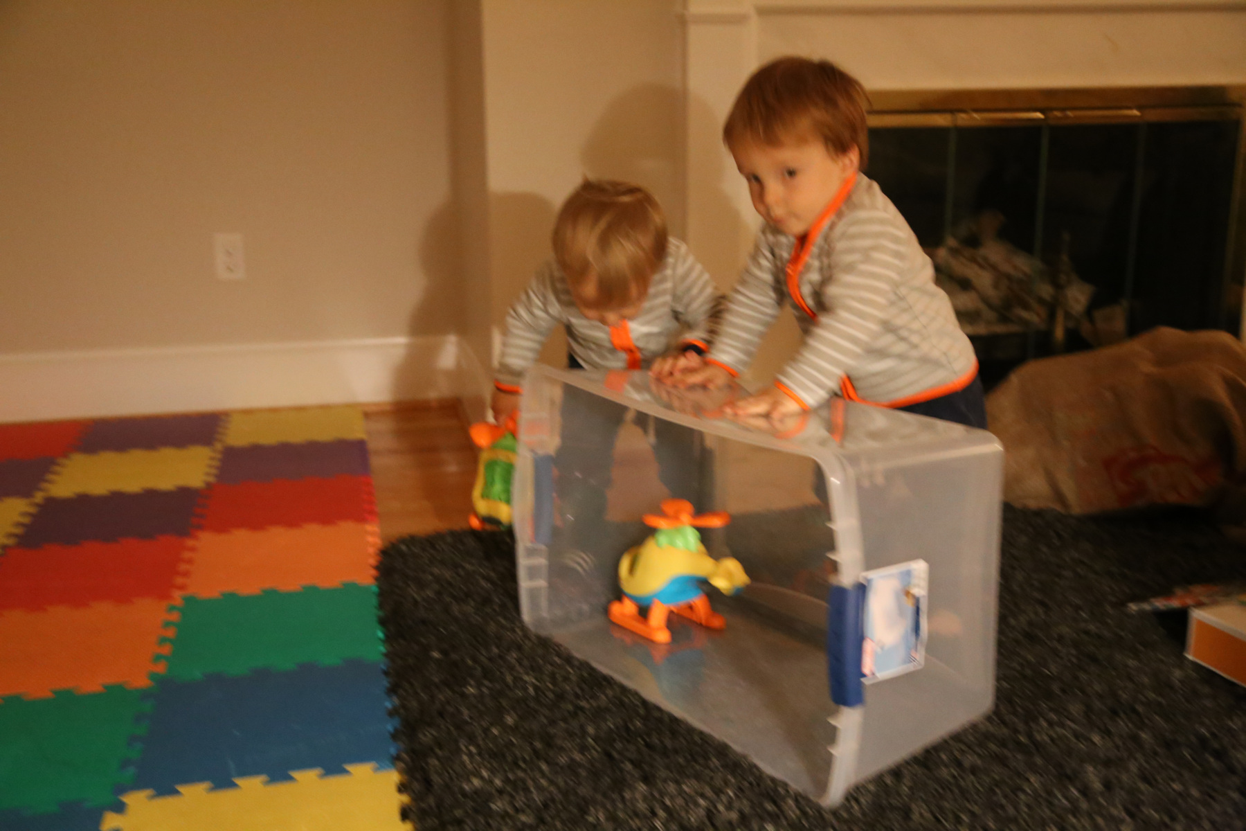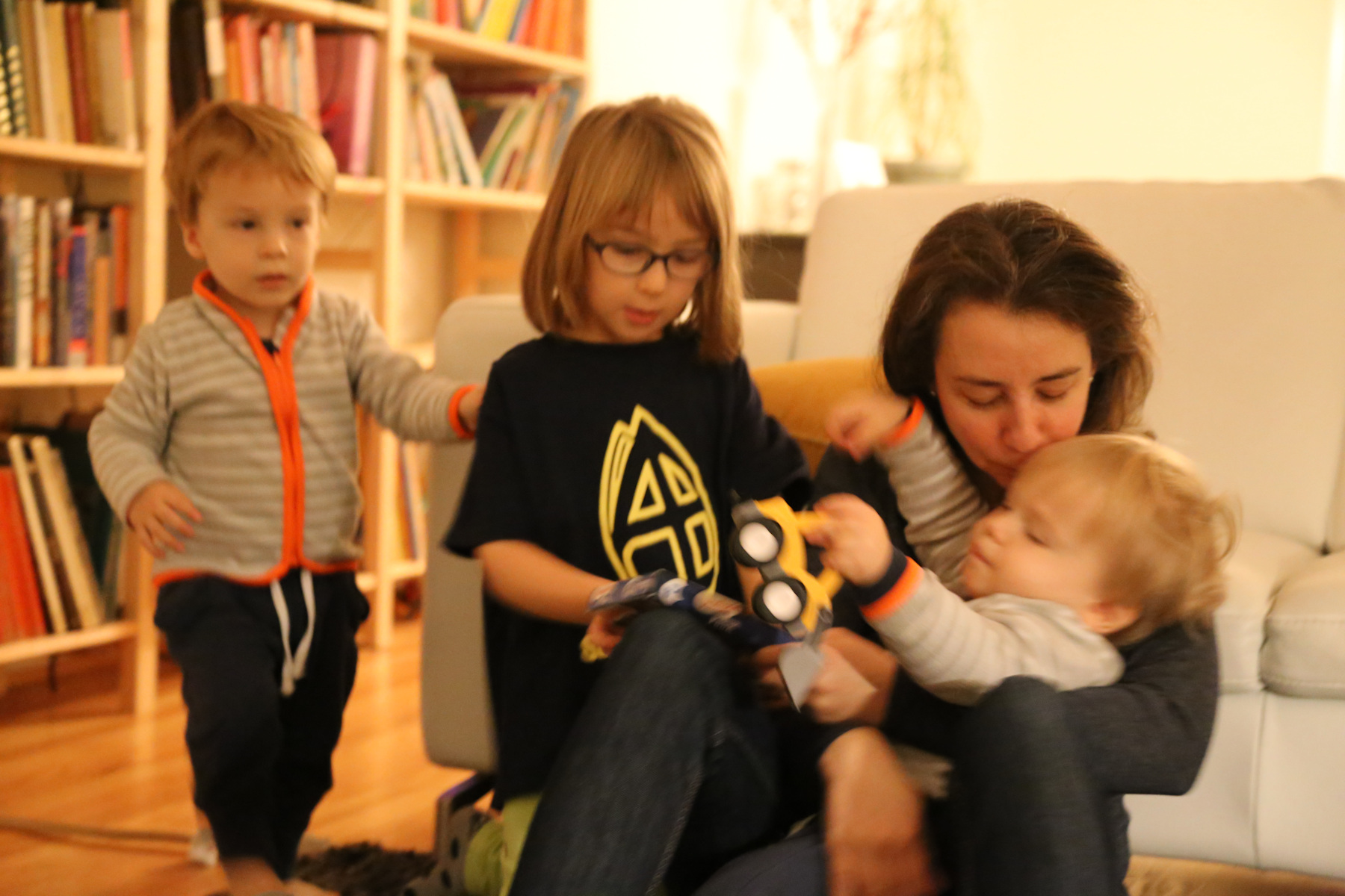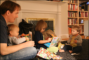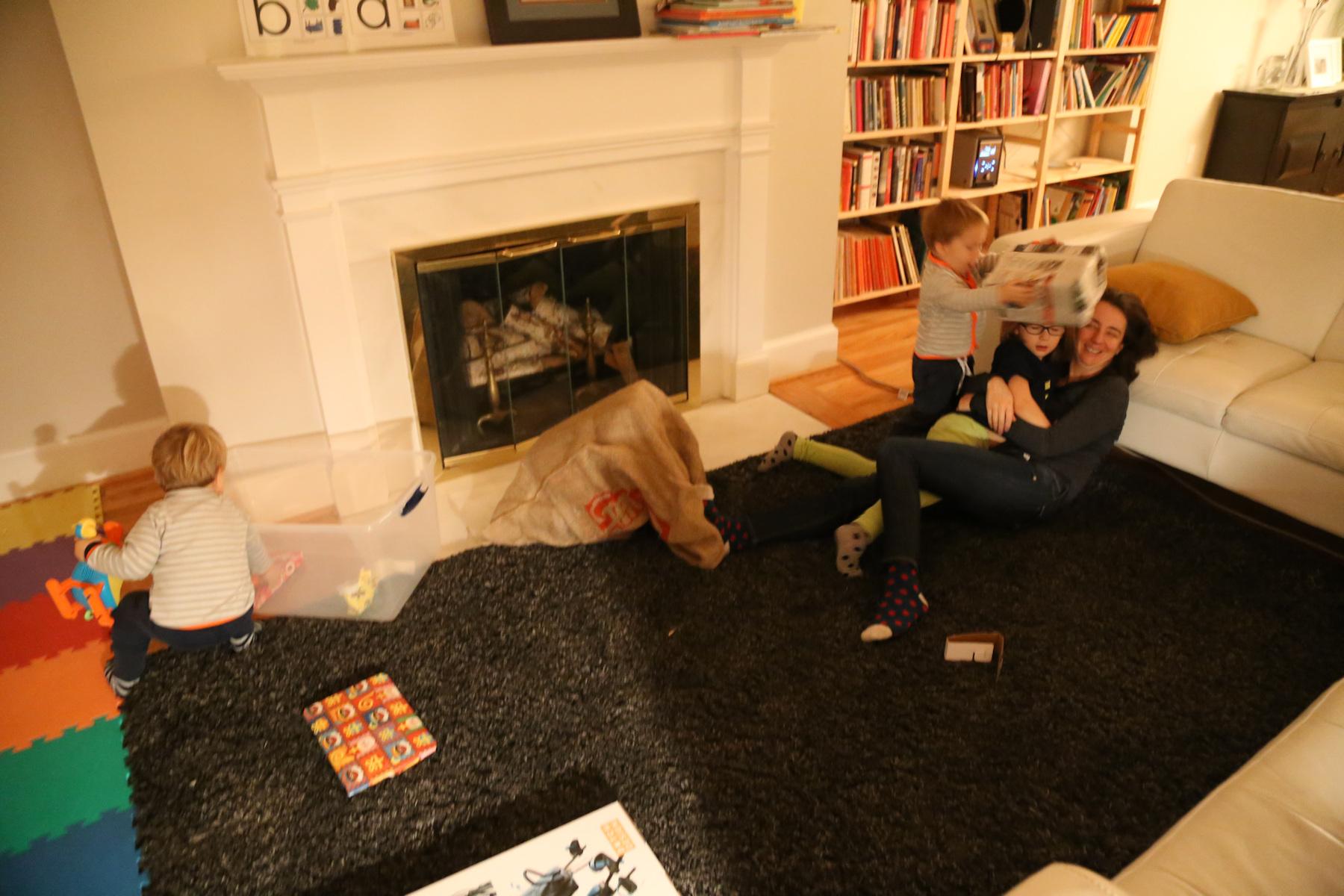Nora's gift remained unopened until we got home. Instead she opened her chocolate letter right away -- she was probably hungry because we skipped lunch. Leo received a Playmobil 123 helicopter, Adrian a garbage truck ("bah!"). The boys also liked to boxes with the chocolate letters. Shanthi helped them unpack their gifts.