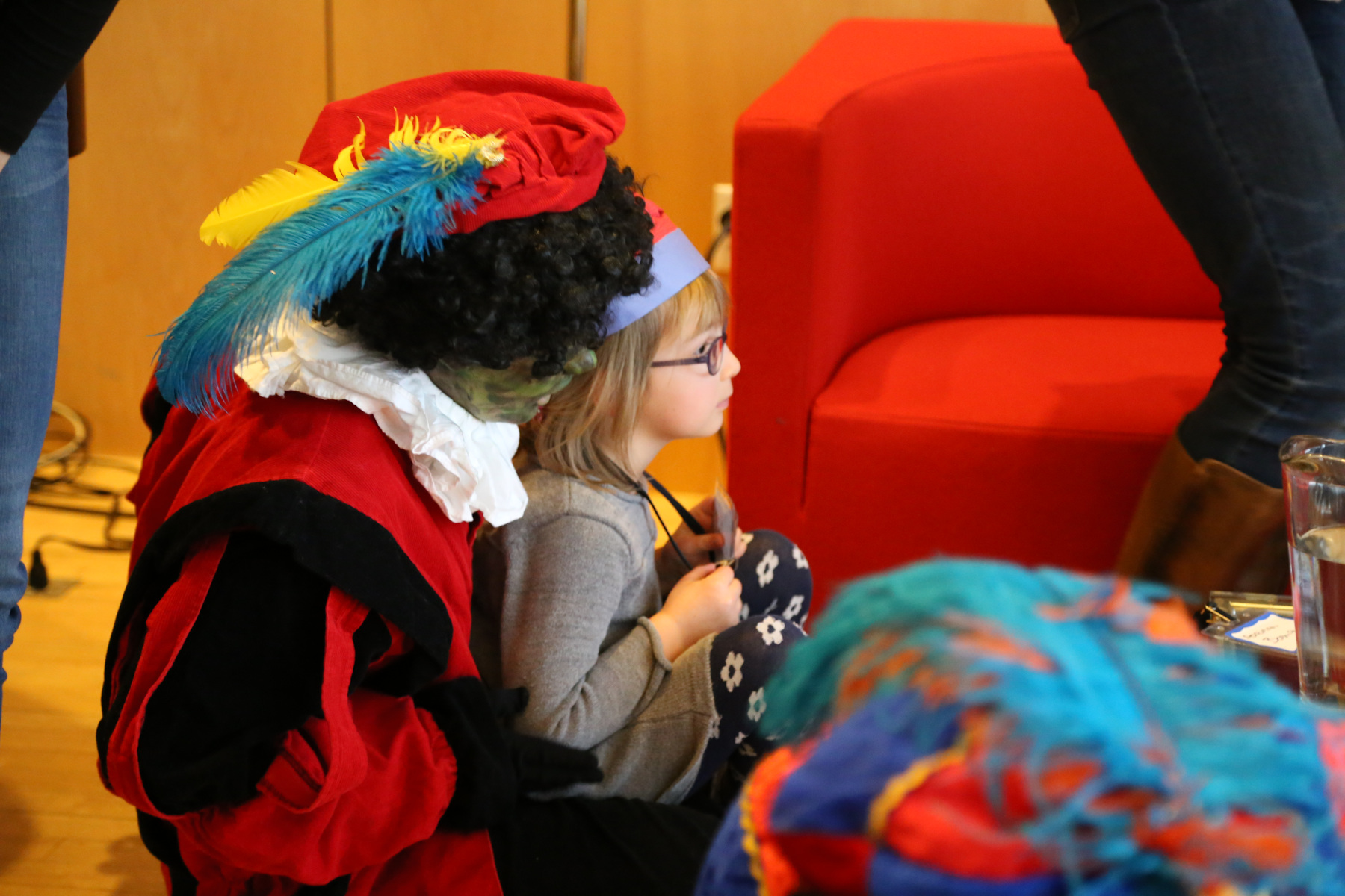 Nora was quite shy. When we left the car there were a few Piets and she wasn't too ready to engage with them. Later that changed and she happily accepted pepernoten. The boys only needed a few minutes to figure out that the Piets were giving away good stuff, and the Piets liked to give them candy so after about 8 handfuls we decided to slow that down.