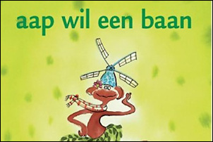 I'm so proud of Nora, I'm bursting. She finished her second "real" book today, Aap wil een baan. I sat down with her, in the basement, and while she was munching on apple slices she completed 6 pages in one sitting.