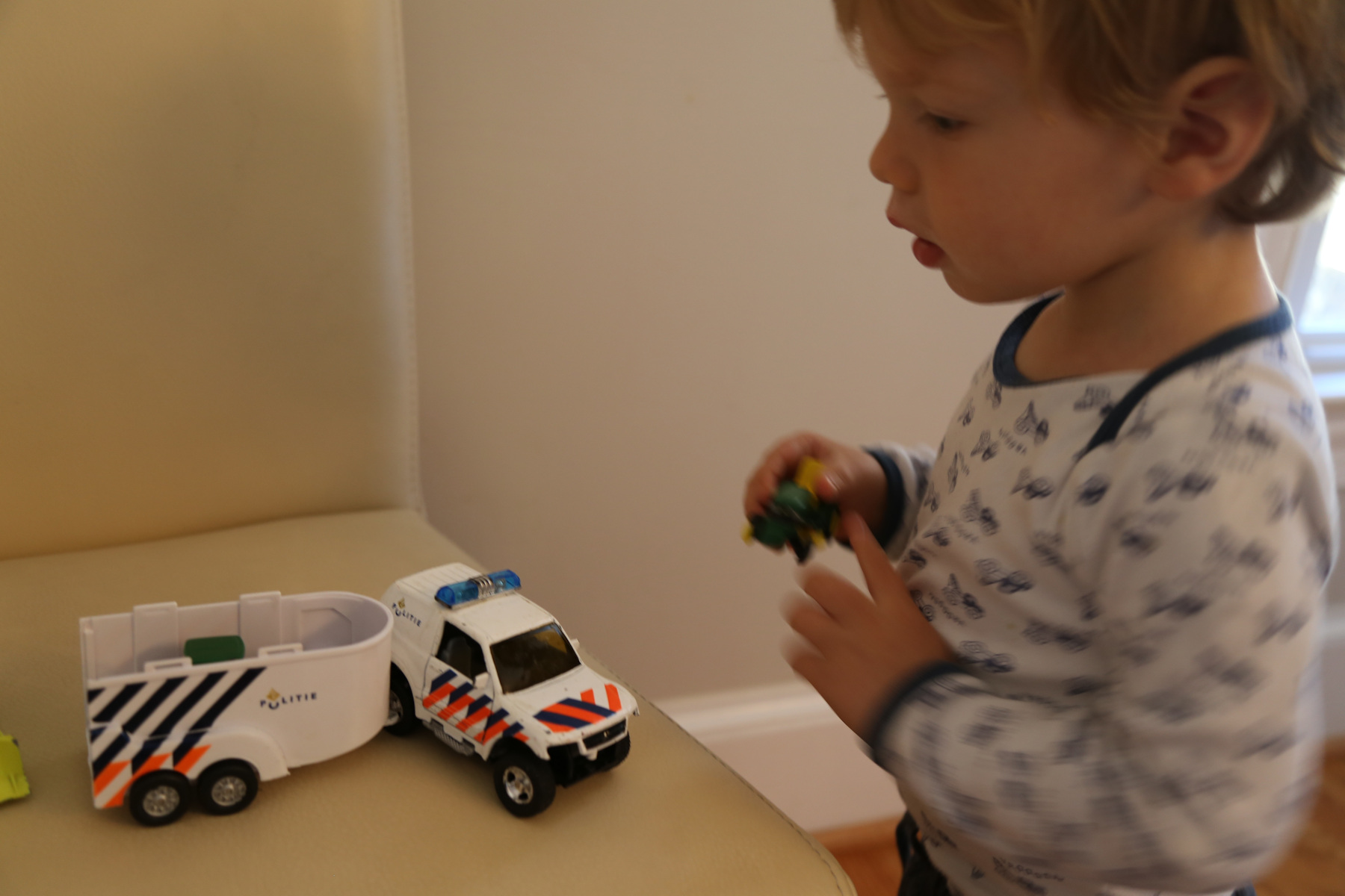 We had a minor social event this morning. Over breakfast Adrian was playing with the police car (a $0.50 purchase at King's Day) and the police horse carrier (a gift from Opa & Oma that has survived rough treatment pretty well).