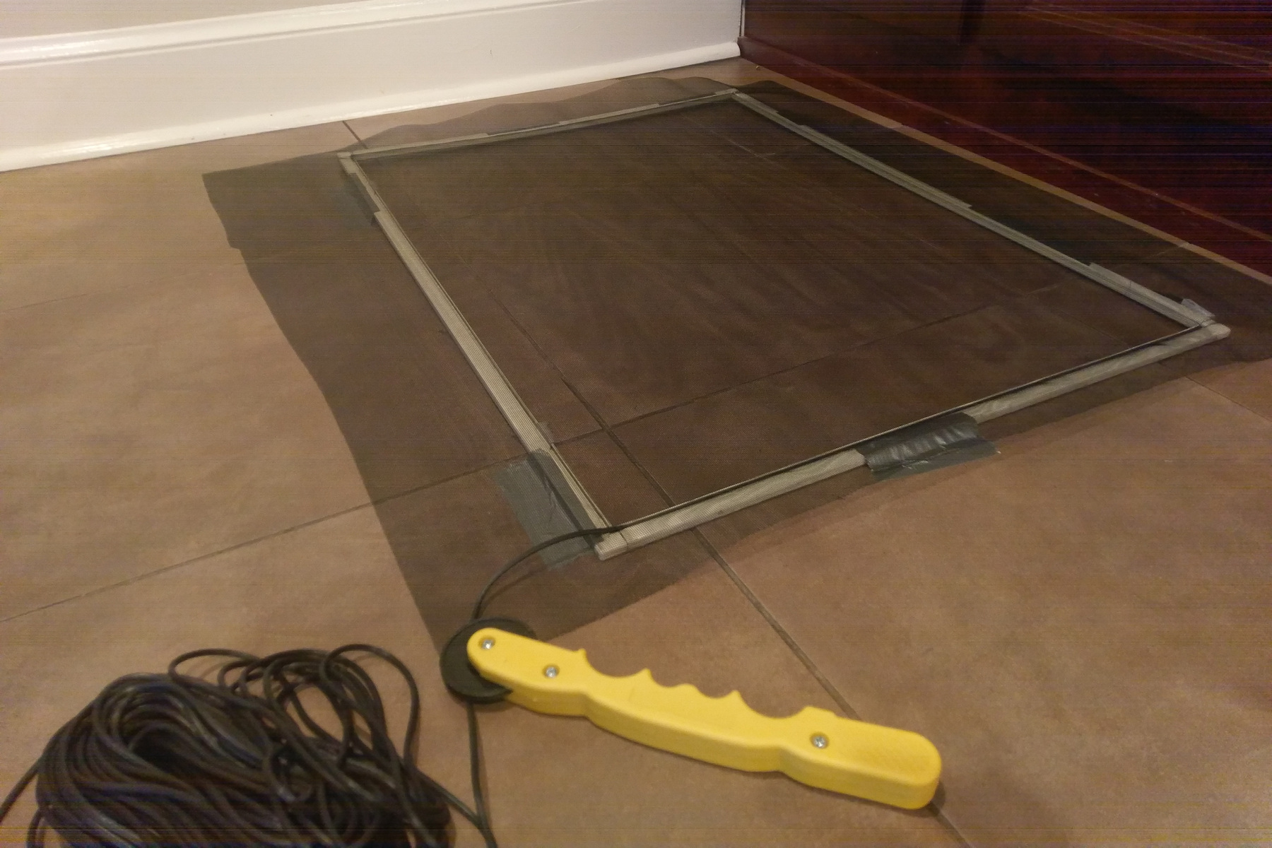 Today I fixed a few of the mesh screens in our house. Leo and Adrian had a period where they liked to poke their tiny fingers through the mesh, and several bedroom windows and downstairs windows were damaged.