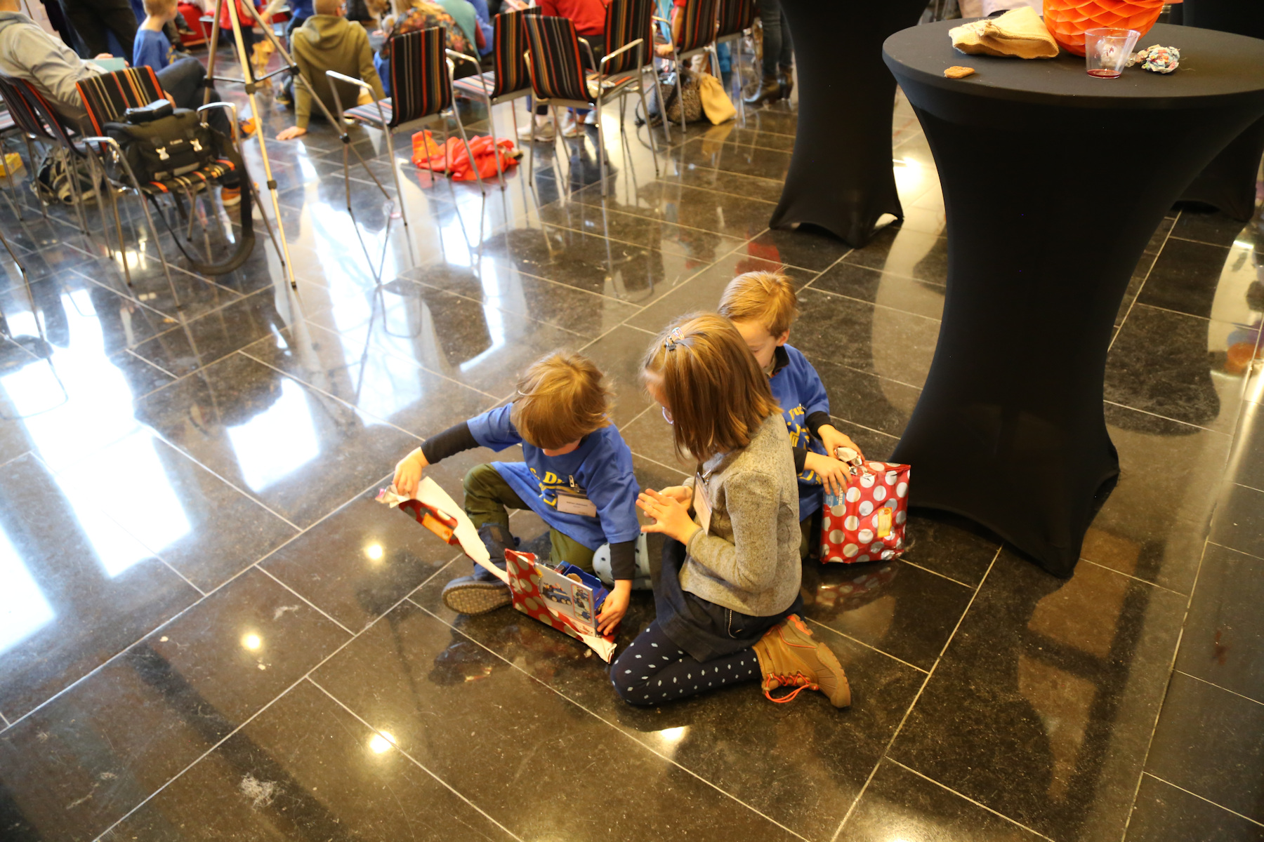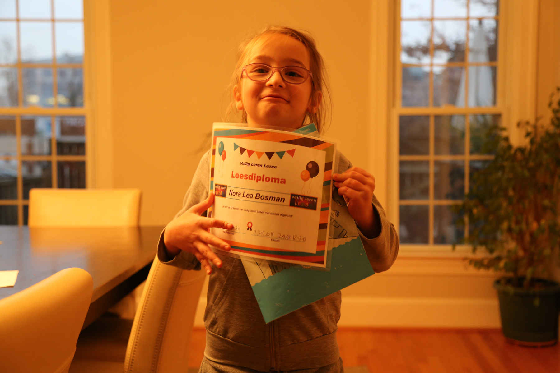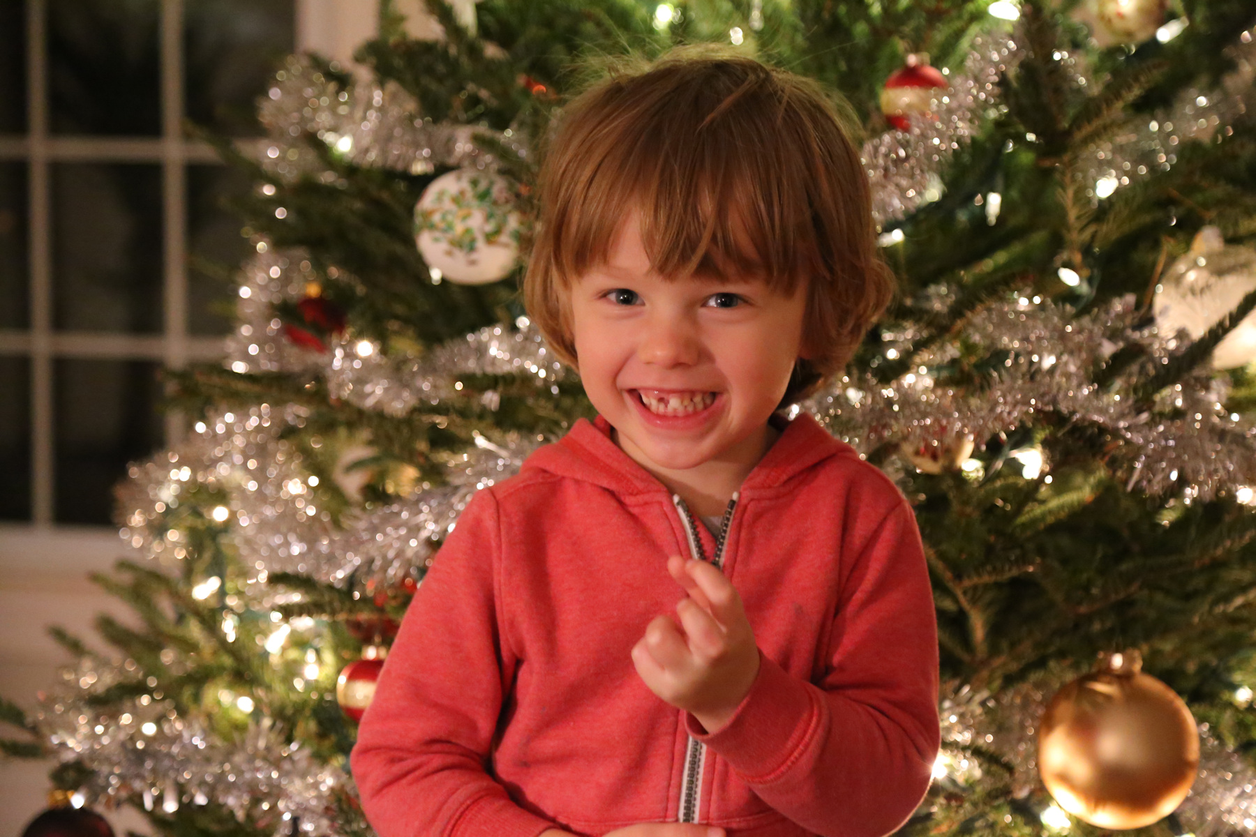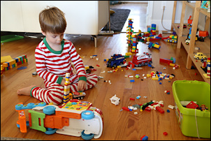 In the morning the boys were downstairs for a while... then I saw Adrian walking around with a dustpan. When I asked what happened, Leo explained that they were kicking the big blue exercise ball, it bounced off the fireplace and then hit the tree and broke one of the Christmas balls. "We waren erg geschrokken", said Leo. Other than that, no damage so far.