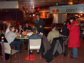 Around 8:00 o'clock we went to a restaurant where we had coffee and breakfast and many friends came to say goodbye. Daniel, Marjolein and Jerry gave me a very welcome present: a large apple pie with the suggestion that I could either bring it in my carry-on luggage or share it immediately with everybody who was there. Ankie, Jean-Paul, Jennie, Jelly, Joost and Richard were there, as well as Tibor and Janneke with their little daughter Fiona. Saying goodbye was sad of course, but seeing all these friends and family members was great.