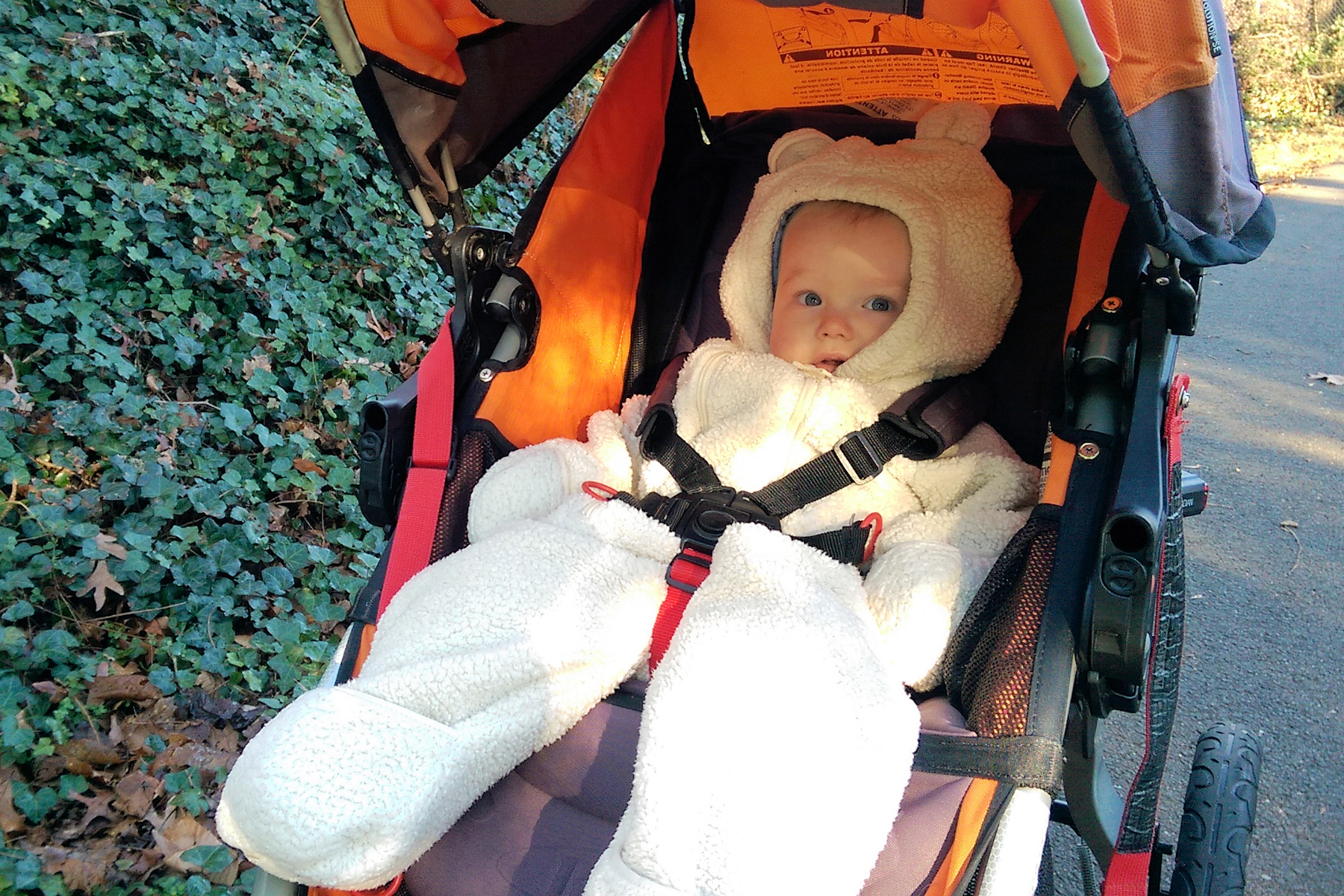 Yesterday I ran with Adrian for the first time. He enjoyed it -- he was moving his legs from excitement when we went downhill and later started singing.