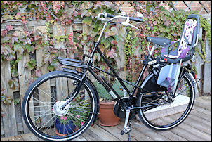 This morning Nora and I went to Whole Foods on the bike and we both enjoyed it a lot. I don't have a crate on the front carrier yet so I temporarily used an Ikea plastic footstool to hold our shopping bag. I made it up on our big hill on 13th street, even with Nora and the groceries, so that's great.
