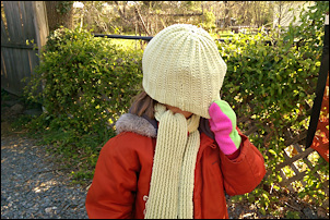 It's been very cold this week -- frost alerts at night -- so we had gloves and shawls. Nora has a nice green hat, and when I looked next to me I saw she had pulled it all the way over her face -- she can see through the little holes and it keeps her face warm, haha.