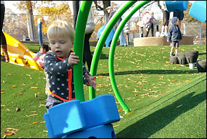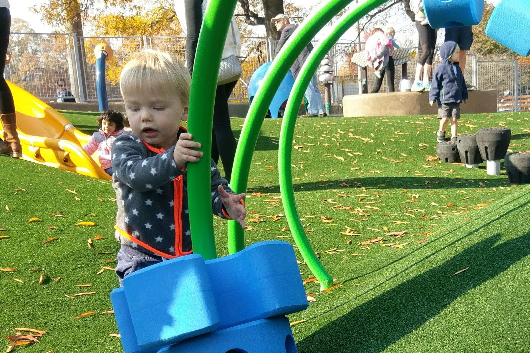It's a beautiful playground, with equipment that is fun for bigger kids too, which is nice because Nora is starting to get a little too old for the things at Hayes park. Adrian loves the music equipment. Not so much to make music yet, but there are "sticks" there to play with, and he loves grabbing those. Leo enjoys playing with the gate of the playground.