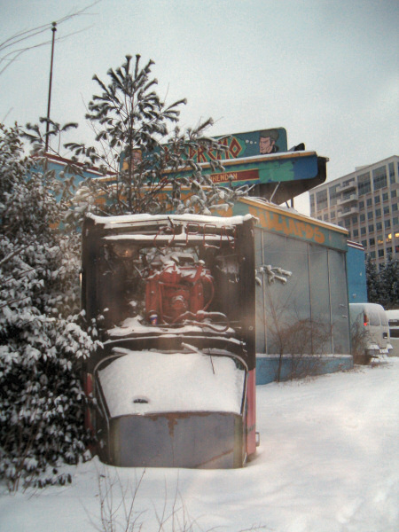 The commercials and outside decorations are still there, and an eye catcher is a car that's standing with its front in the air.